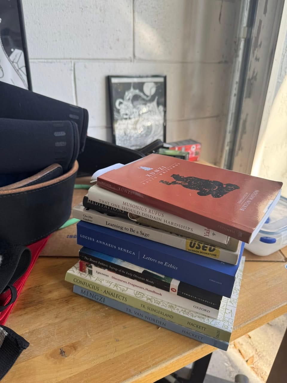 I noticed that I’ve slipped into a few bad habits recently, relating both to my mental and my physical health, and I resolved this morning to try to make things better. The first step involved getting back into weight training after a couple weeks off, and a new discipline between sets: I’ve stacked a pile of some of my favorite works of practical philosophy, mostly Confucian and Stoic, on the table in the garage, and in between sets I read a few passages from one rather than scrolling on my phone.